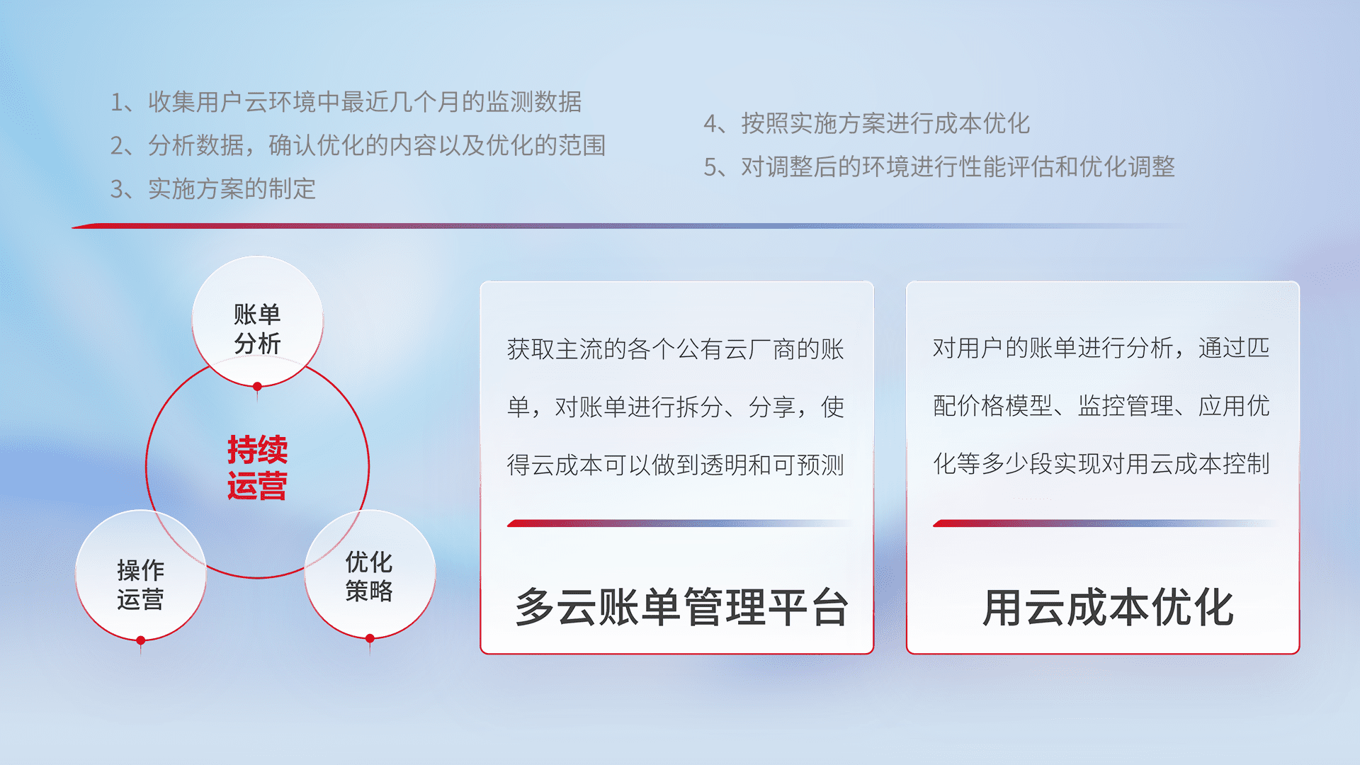 通过多云纳管,,以统一的资源数据模型把客户的云资源进行抽象和封装,,,进而实现对多云资源的统一操作,,,保障云资源管理的可靠性、、、稳定性与可用性。。量身定制化运维内容,,,配置、、、、开发运维、、、补丁管理、、、备份、、、、监控、、认证和访问管理、、审计和日常巡检等,,保障在用云过程中的可靠度,,稳定度以及高可用率。。。。