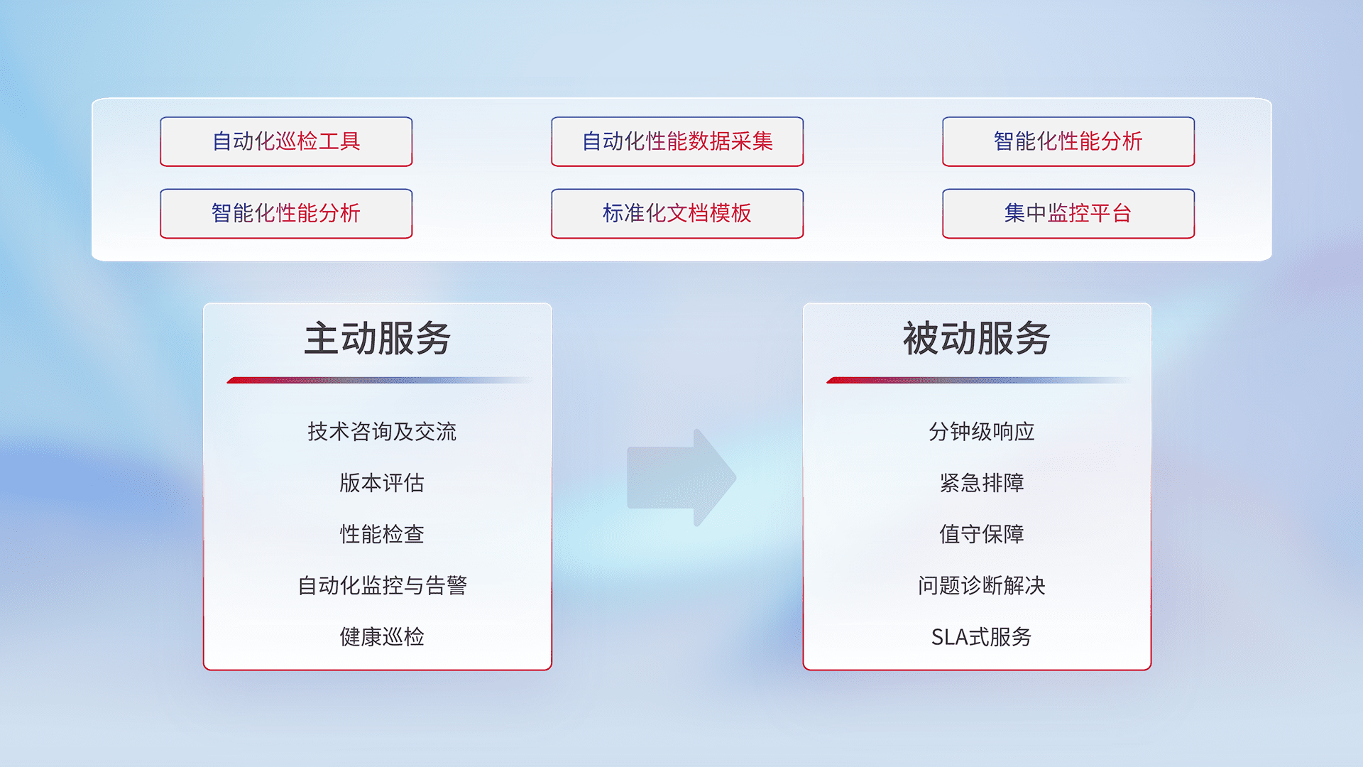 智能化工具和标准化文档,,,保障服务质量,,提供主动服务(包含技术咨询、、版本评估、、性能检查、、、、自动化监控与告警、、、健康巡检)和被动服务包含(分钟级响应、、、紧急排障、、值守保障、、、、问题诊断解决、、、、SLA服务)。。。